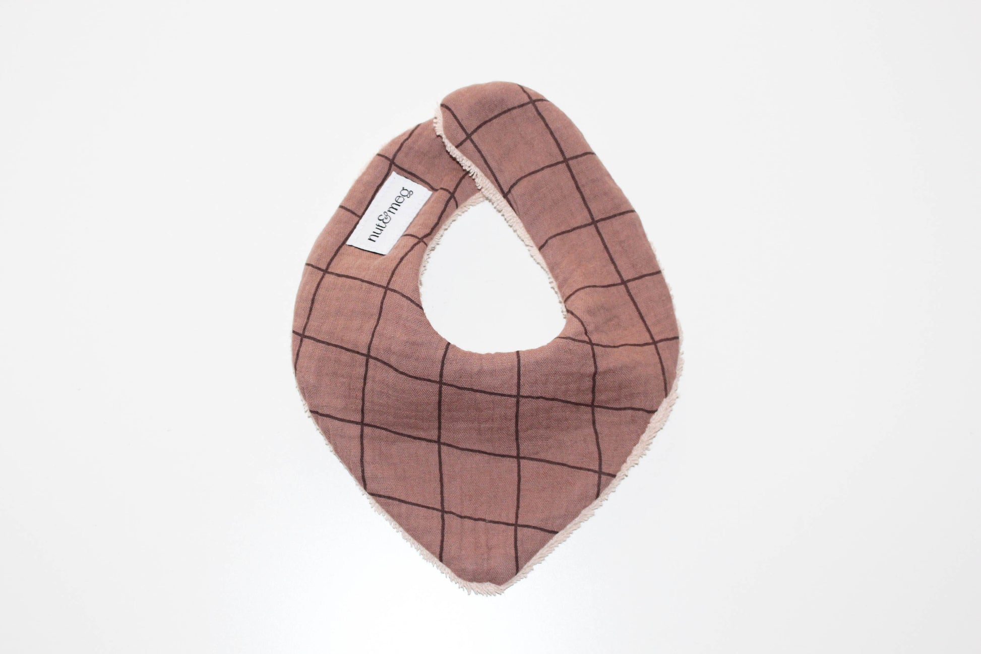 La cara exterior está realizada en muselina de algodón color cacao con un delicado cuadro ventana en tono chocolate, un diseño elegante y atemporal que combina con cualquier outfit. En el reverso, cuenta con rizo de toalla beige, ideal para absorber babitas, pequeñas regurgitaciones o restos de comida.