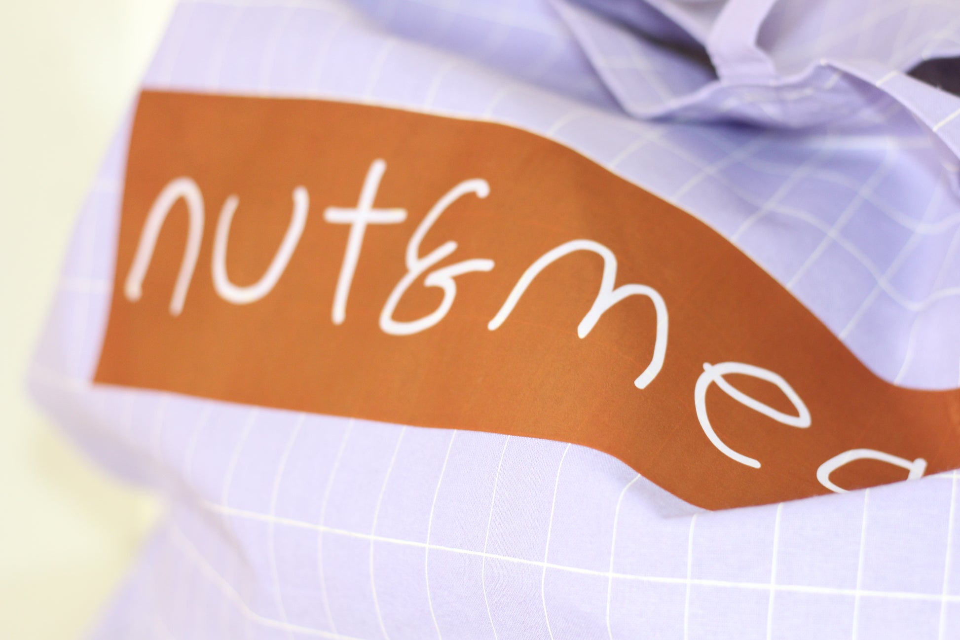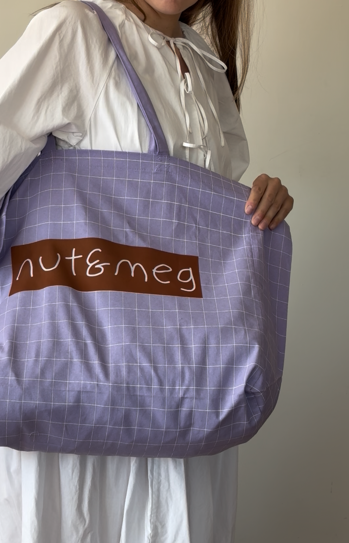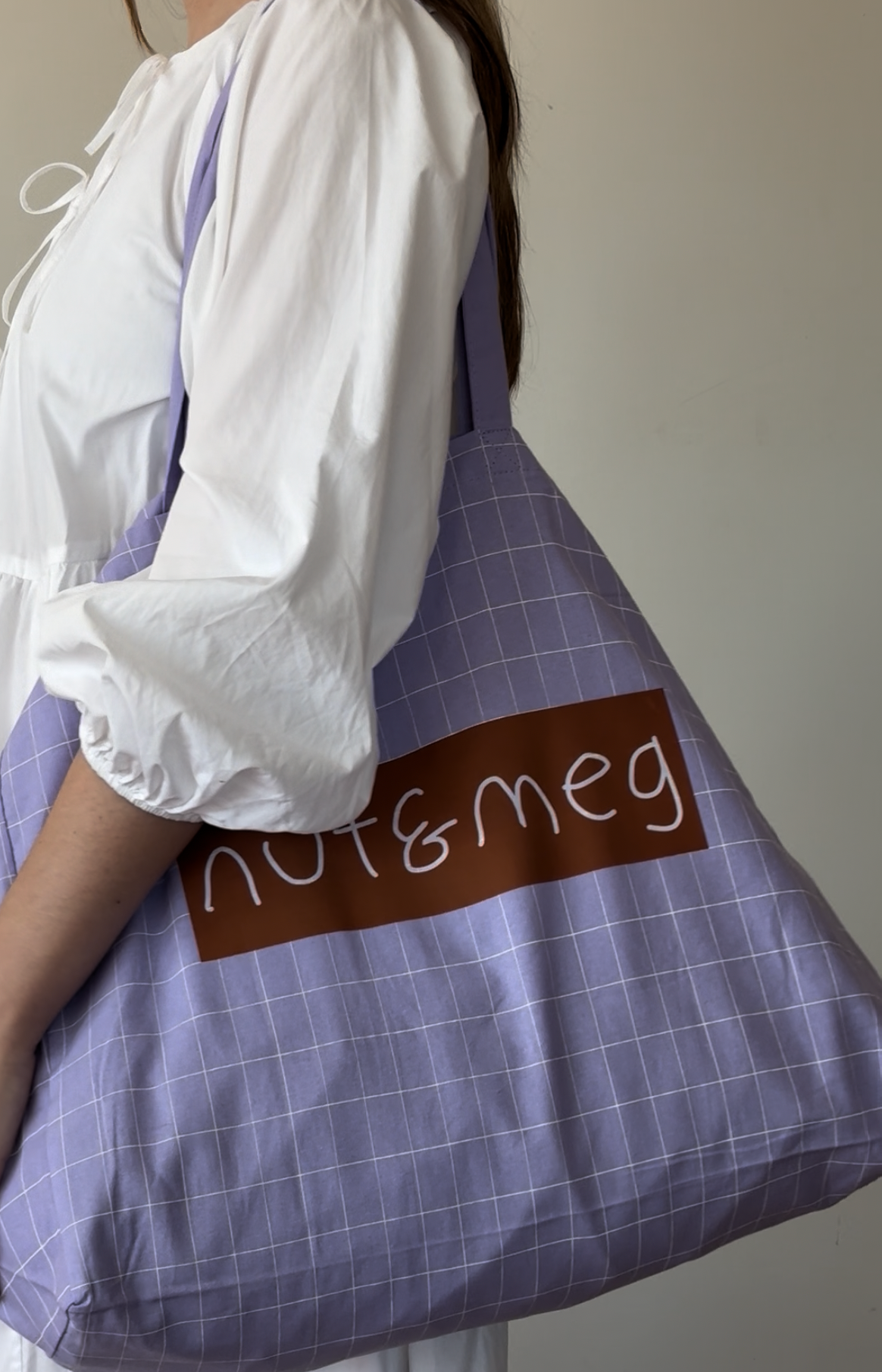 Con un all over de cuadro ventana sobre fondo color lavanda + posicional nut&meg en la tipografía de la marca.
