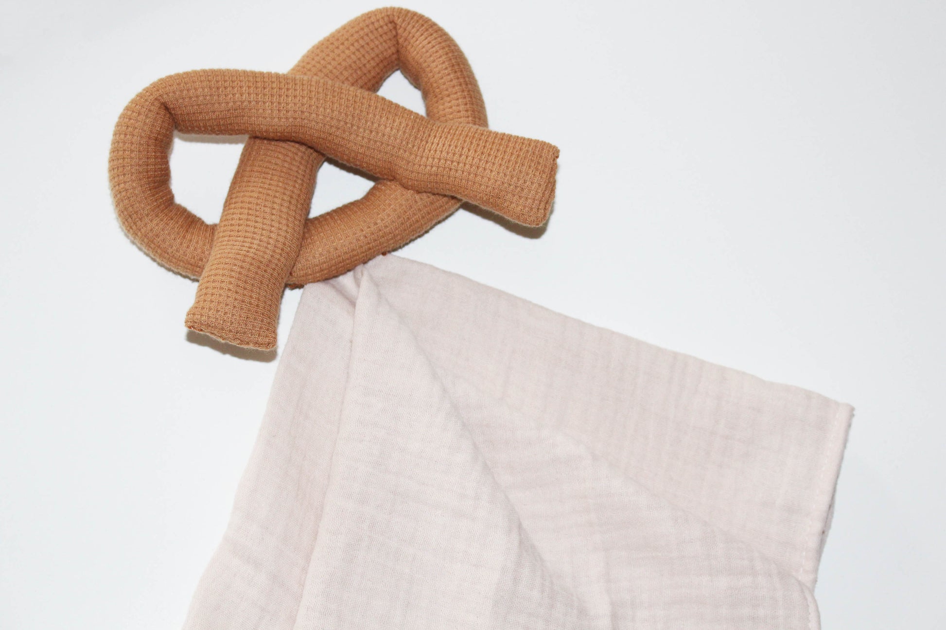 Está inspirado en uno de los símbolos más especiales de Nut&Meg, el pretzel, diferenciándose de los diseños de doudou más tradicionales, para ofrecer una alternativa diferente, divertida y con mucha personalidad.